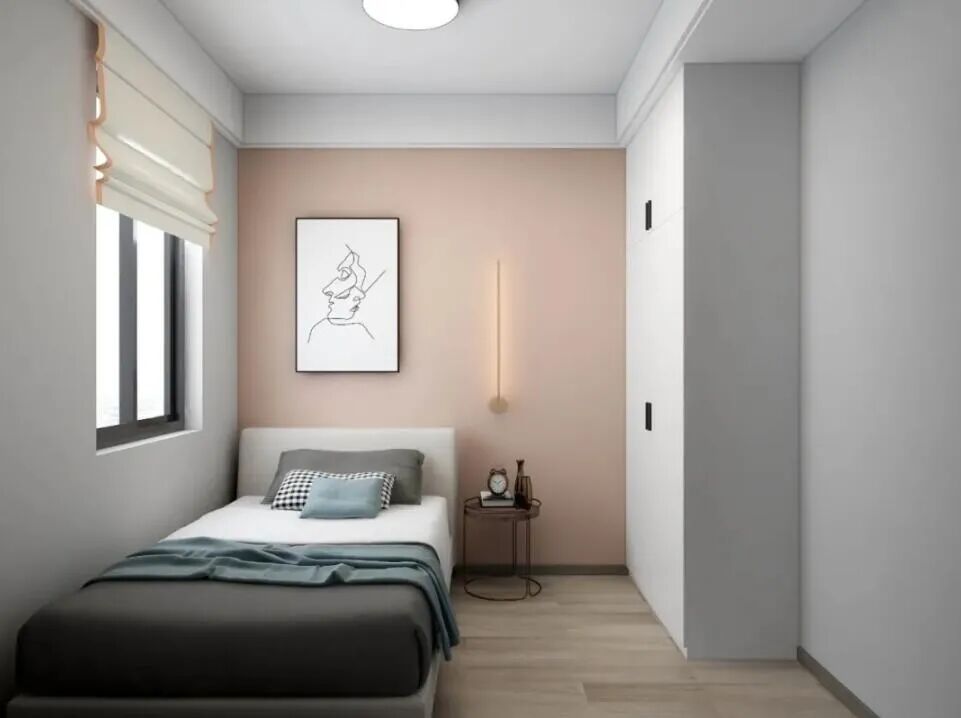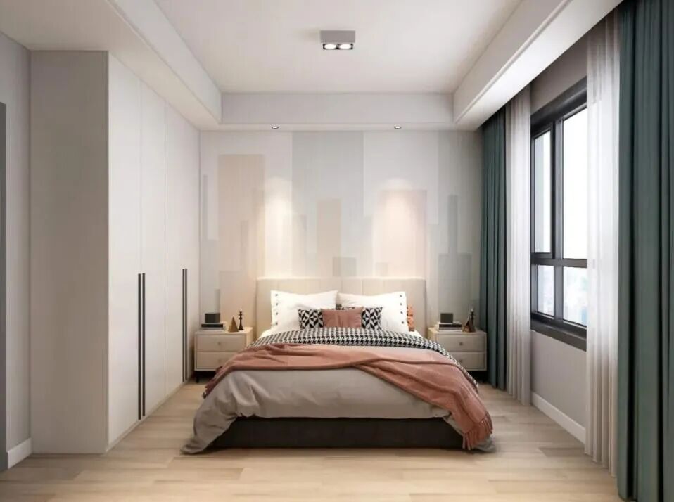 筒灯照明,让照明光线更加柔和。衣柜与墙面整体的空间留白,让飘窗透射的自然光更加通透。