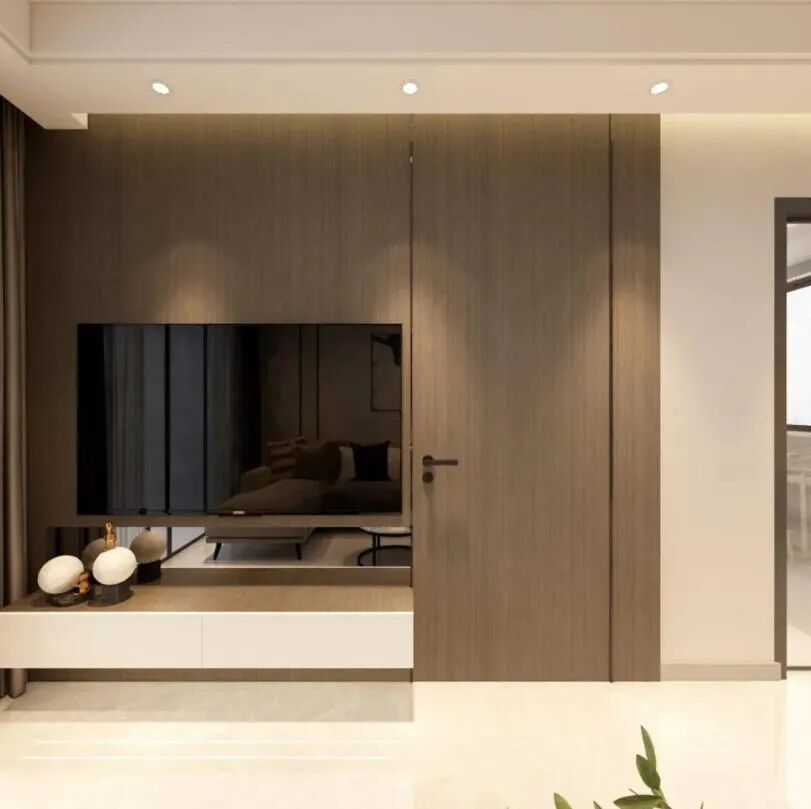电视墙选了整墙的胡桃色木饰面板,增加了客厅的高级感。