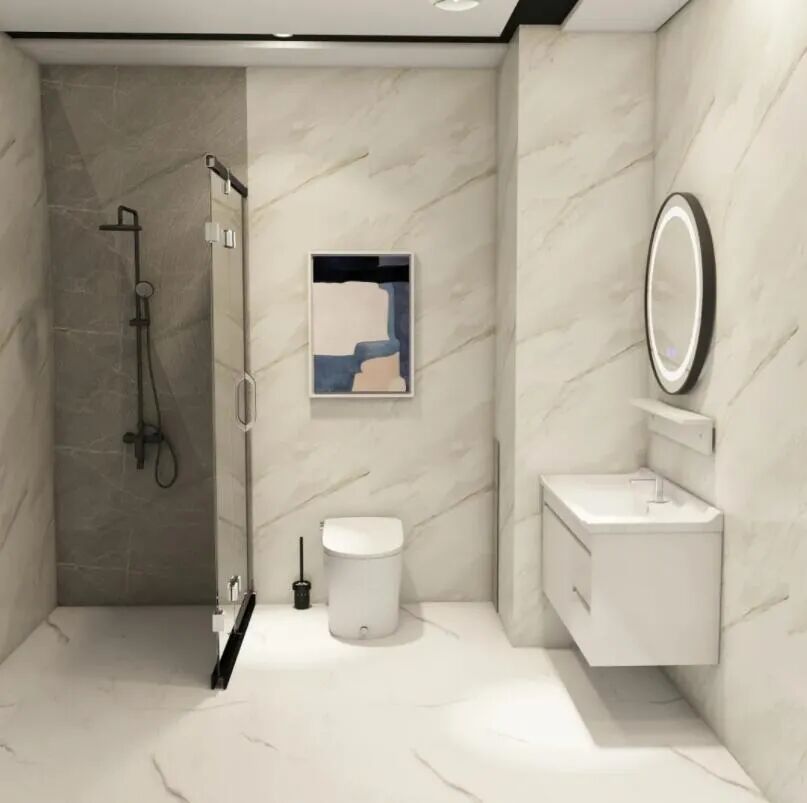 大理石瓷砖搭配简约浴室柜,智能马桶提升了整体的档次,尽显洗浴环境的质感。