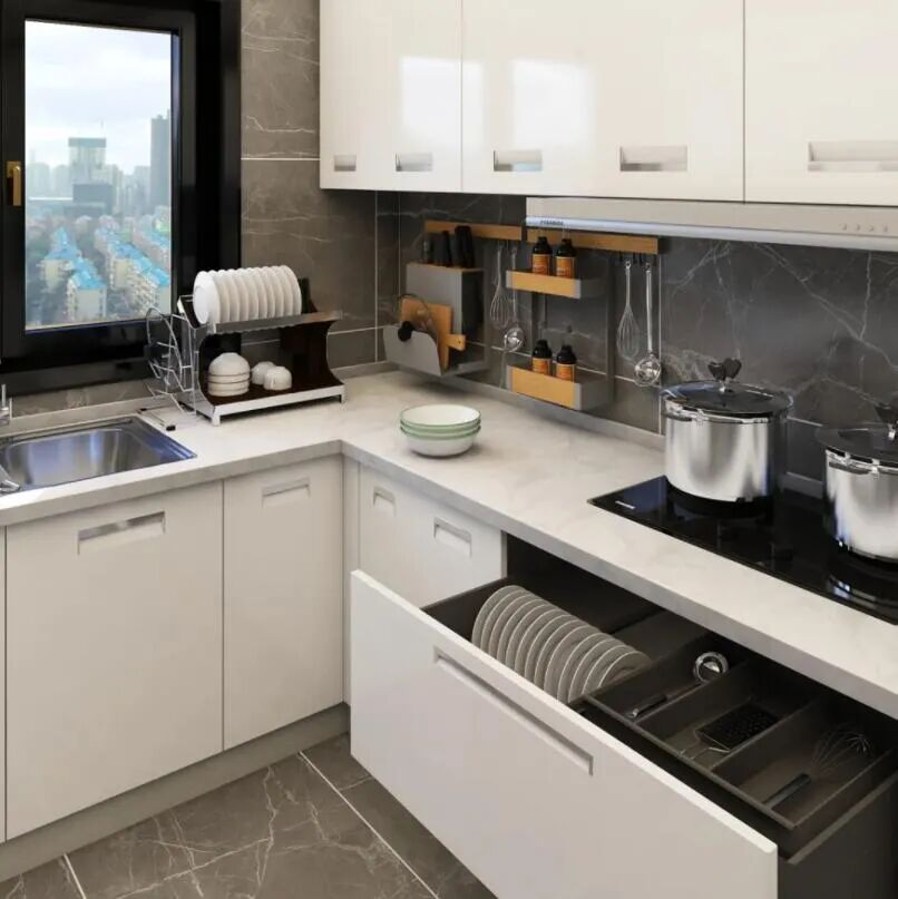 灶台下的抽屉分类摆放碗筷,方便收纳更多物品。台面上的钢钩位置可以随意调节,易于屋主放置厨房用具。