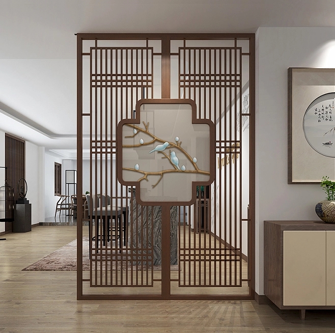 楼梯玄关与客厅用金属隔断,中式的边几与挂画,元素的搭配更加稳重。