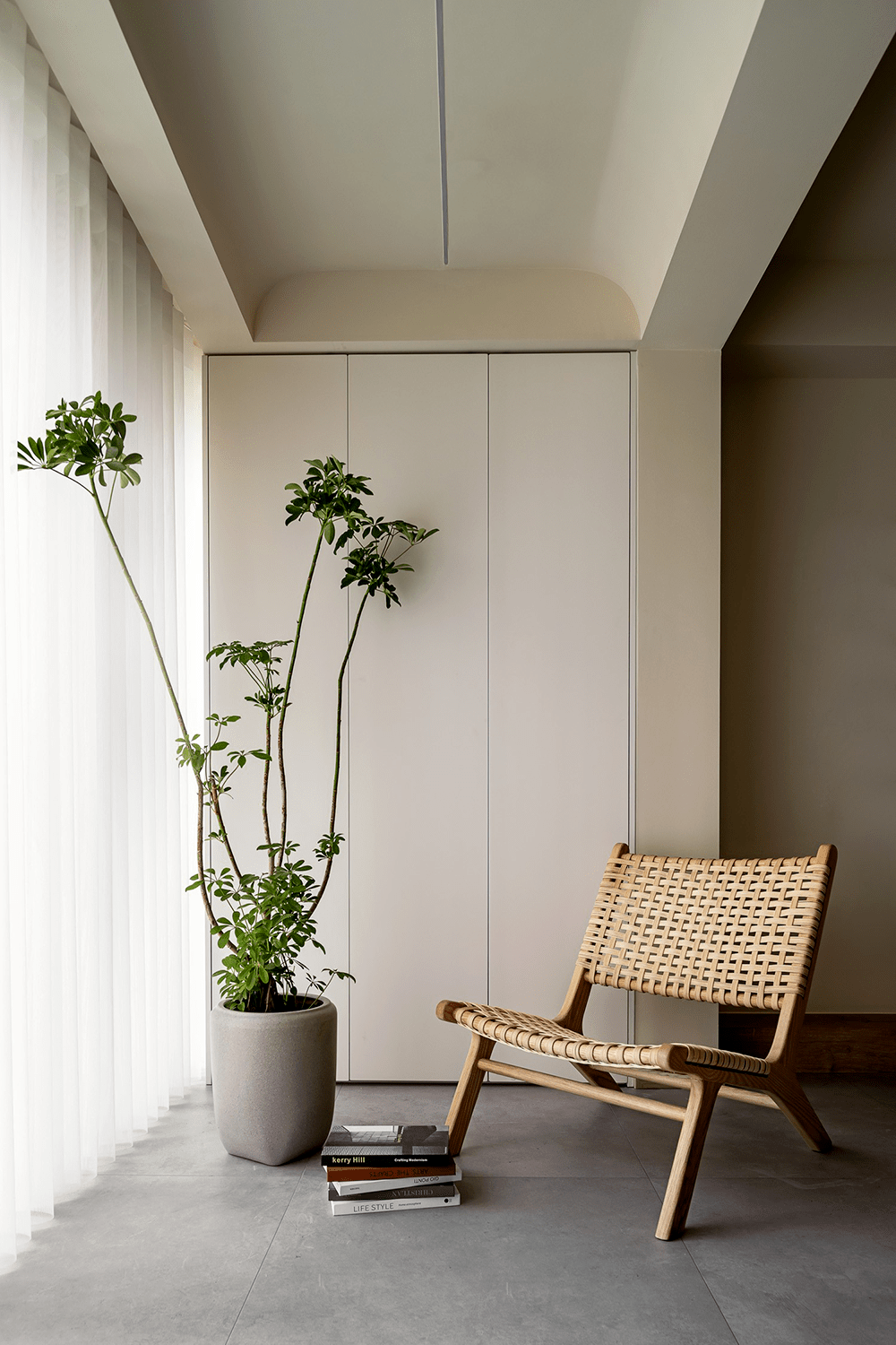 不去追求流行,也不过度的堆砌设计语汇,甚至于不去追求明亮与饱和。家的氛围是自然形成的温柔与温暖,寂声且寂色。卧室的设计延续了空间的整体风格,以简约线条和色块打造宁静自然的睡眠空间,柔软之处体现于家具单品的质感,构建身体尺度的舒适与放松。干净利落的线条在立面上充分延展空间,低调与自然尽数展现,洗净一天的疲惫,静享好睡眠。
